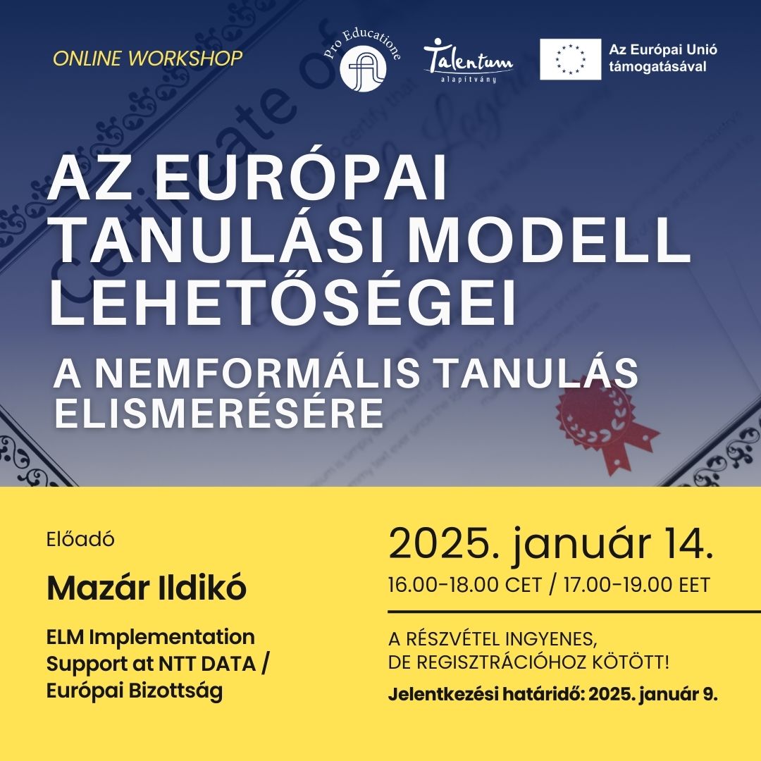 A workshopon megismerhetjük az Európai Tanulási Modell (ELM) rendszerét, amely a formális tanulás elismerése mellett lehetőséget biztosít a nemformális tanulási környezetben szerzett és validált tanulási eredmények elismerésére is. A workshopon első kézből kaphatunk információt az Europass rendszeréről, a digitális tanúsítványok előnyeiről, az ELM célkitűzéseiről.
