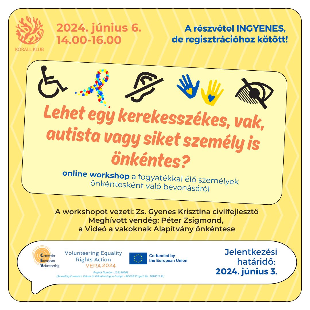 Ez a workshop az önkénteseket bevonó szervezeteknek és önkéntesmenedzsereknek szól, akik növelni szeretnék kapacitásaikat és ismereteiket arról, hogyan lehet a fogyatékossággal élő személyeket a legjobban bevonni önkéntesnek olyan módon, amely hozzáférhető, befogadó, és a leginkább képessé teszi őket arra, hogy tevékenységükkel valós pozitív hatást gyakoroljanak a társadalomra.