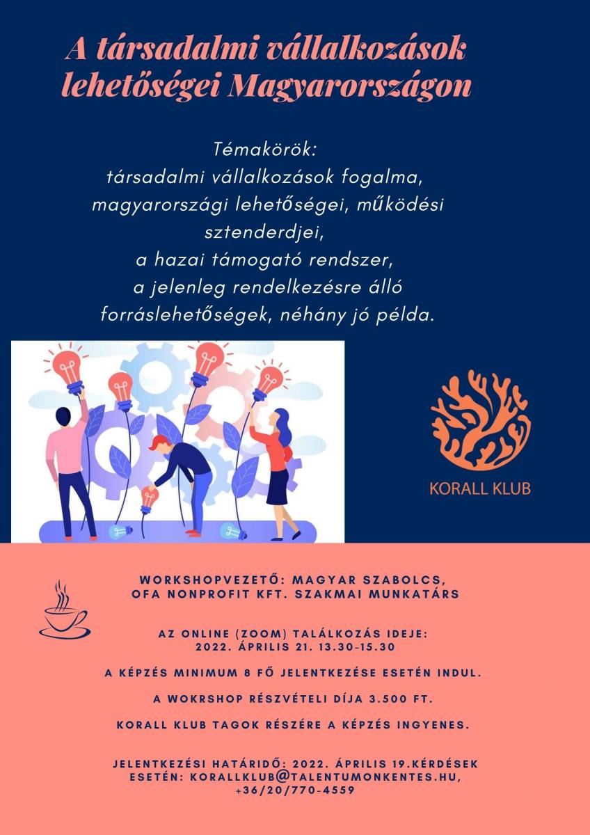 A workshop keretében bemutatásra kerül a társadalmi vállalkozások fogalma, magyarországi helyzete, működési sztenderdjei. Áttekintjük a hazai támogató rendszert, valamint a jelenleg rendelkezésre álló forráslehetőségeket.